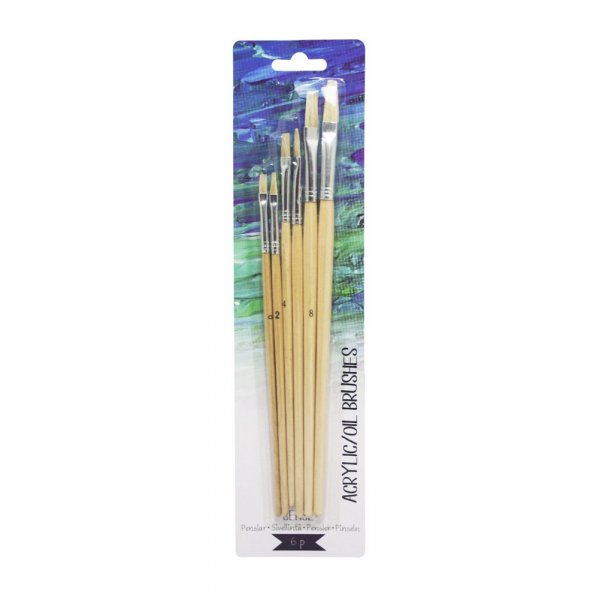 Eine Packung mit sechs verschiedenen Pinseln für Öl- und Acrylmalerei. Diese sind steifer als Aquarellpinsel, um beim Malen mehr Widerstand zu bieten.