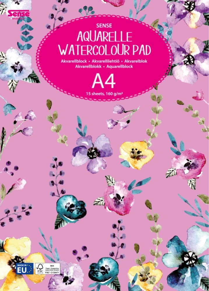 Sense-Aquarellblöcke im A4-Format haben eine feine Textur und sind von guter Qualität. 15 Blatt, 160 g/m², geeignet für Flüssigfarben und Aquarellstifte. Der Block ist FSC-zertifiziert.