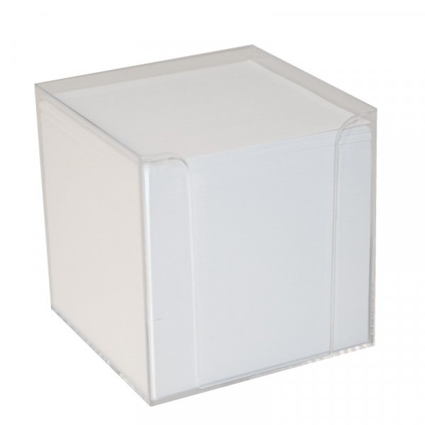 Blockwürfel mit Halterung aus transparentem Kunststoff. 700 ungeklebte Blätter in Weiß. Außenmaße 9,5 x 9,5 cm.