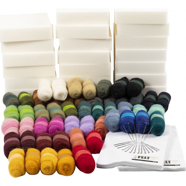 Set mit kardierter Wolle, Platte und Filznadeln zum Nadelfilzen von Bildern. Eine intelligenzstimulierende Aktivität für Kinder. Enthält: 20 Nadelfilzplatten, 1300 g kardierte Wolle, 20 Bögen Hobbyfilz und 20 Filznadeln.