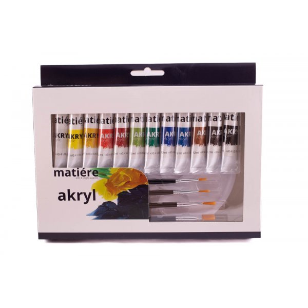 Ein schönes Einstiegsset für alle, die mit der Acrylmalerei beginnen möchten. Enthält 17 in Farben unterteilte Teile, eine Palette und vier Pinsel in verschiedenen Größen.