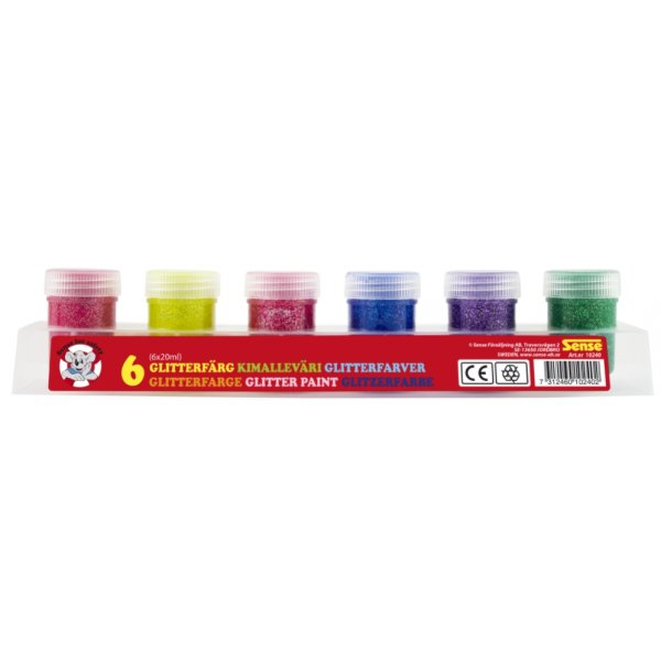 Ein farbenfrohes Set aus 6 Dosen mit intensiv glitzernder Farbe, perfekt zum Basteln. Die feine Farbe sorgt für ein leicht transparentes Ergebnis und eignet sich daher auch als Glitzerschicht auf anderen bemalten Papieroberflächen. Jedes Glas enthält 20 ml. Die enthaltenen Farben sind Pink, Gelb, Rot, Blau, Lila und Grün. Um ein Umkippen während des Malvorgangs zu verhindern, sind die Dosen in einer Mulde integriert. Zur Verwendung mit einem Pinsel.