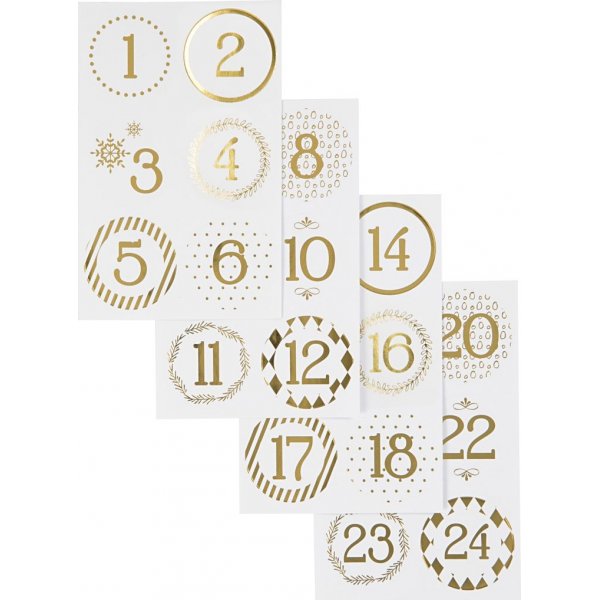 Selbstklebende Aufkleber mit mattierter Oberfläche von Vivi Gade Design mit Foliendruck. Verpackung mit den Zahlen 1-24.