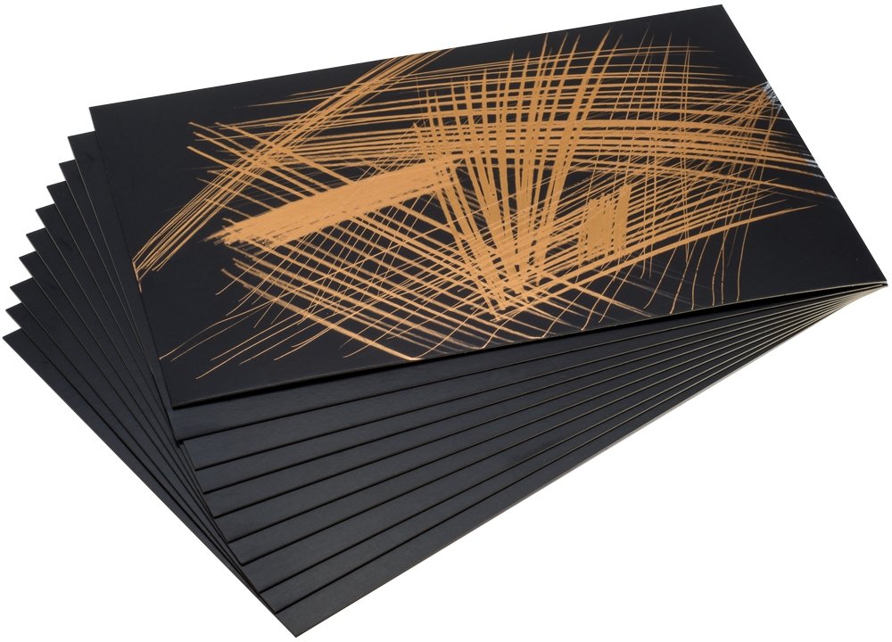 Kratzen Sie die dichte schwarze Oberfläche ab, um die schimmernde goldene Oberfläche darunter freizulegen. Verleihen Sie Ihrem Kunstwerk mit dieser feinen goldenen Rubbelfolie einen Hauch von Klasse. 10 Stück in einer Packung.