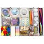 Enthält: Foam Clay, Silk Clay, Sticky Base, kleine Pailletten, Pompons, gemustertes Papier, selbstklebende Augenroller, Holzperlen mit Gesichtern, Nylonschnur, Kunststoffperlen, dekorative Gummifiguren mit Glitzer, farbige Eisstiele, Streichhölzer, Pfeifenreiniger und Glitzerbommeln.