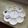 Eine kleinere Kunststoffpalette im Blumendesign mit tiefen Schalen zum Farbmischen.
