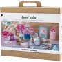 Inhalt: Pinsel, EVA-Dekorgummi, bewegliche Augen, Pfeifenreiniger, Acrylfarbe, Strasssteine, Kuchenstücke, Garnknäuel, Kunststoffgarn, Papier, holografisches Papier, Glitzerpapier, Marker, Pailletten, Styroporkugeln, Holzstäbchen, Glitzerpailletten