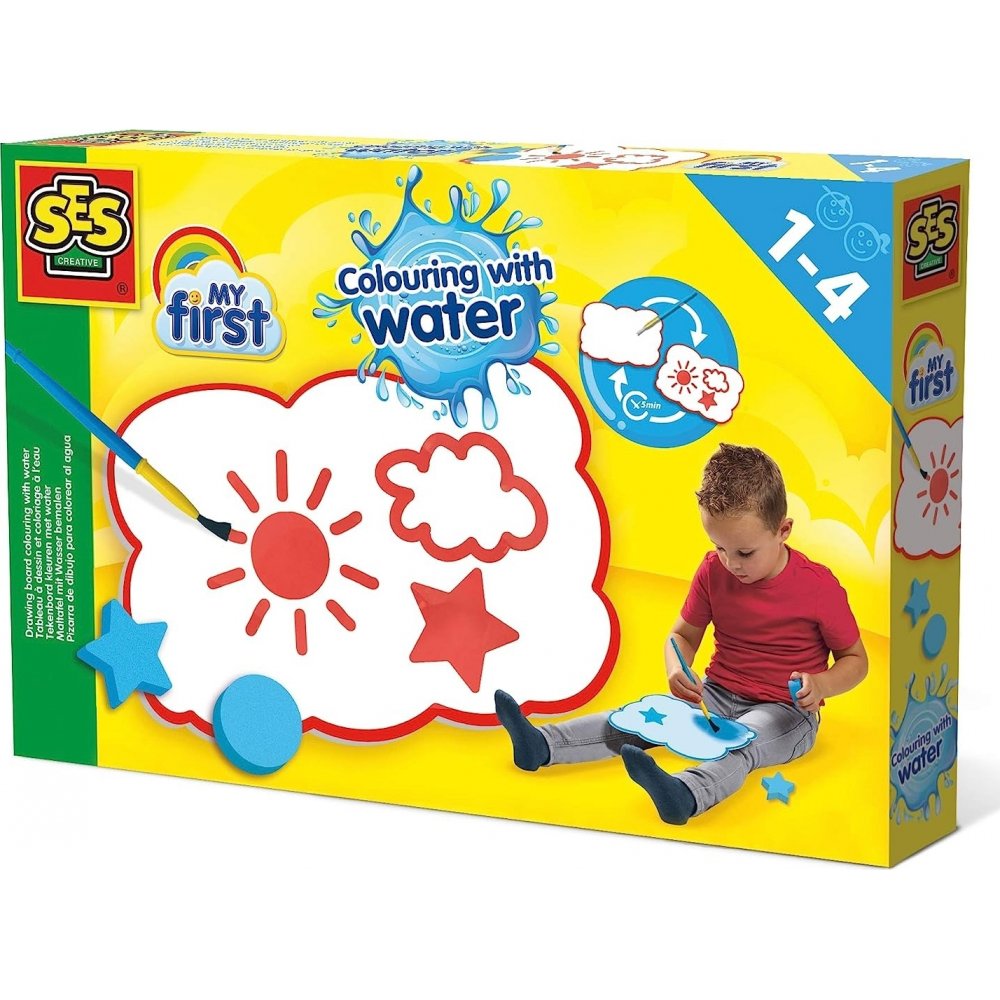 Benutzen Sie den Schaumstoffstern und -kreis zum Stempeln der Formen oder malen Sie mit dem Pinsel, um den magischen Effekt zu entdecken, den Wasser auf diesem Zeichenbrett erzeugt. Wenn die Platte trocken ist, verschwinden die Farben, sodass Sie sie immer wieder neu bemalen können.