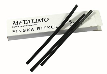 Finnische Holzkohle. Box mit 3 runden und 2 eckigen Holzkohlen.