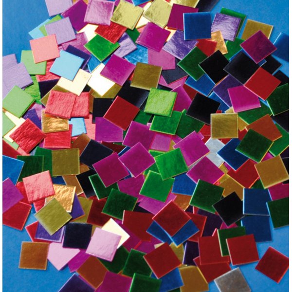 10.000 Stück Papiermosaik in gemischten Metallicfarben mit der Größe 10x10 mm.
