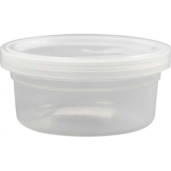 Durchsichtiges PP-Kunststoffgefäß mit weichem Kunststoffdeckel.