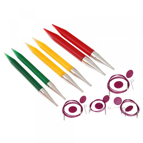 Dieses Set beinhaltet: 3 Paar Stricknadeln, 4 Kabel und 8 Kabelstopper sowie 5 Kabelwerkzeuge.